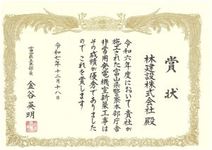 本賞は令和6年度に完成した富山県発注の建設工事において、優良な工事の施工者に賞を授与されるもので、